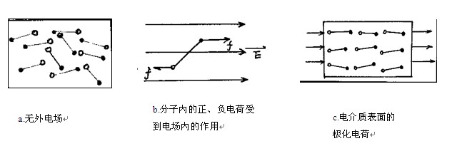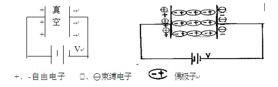 在電介質內部形成偶極矩,而在與外電場垂直的電介質表面上,出現了與極板上電荷反號的極化電荷,即電介質的極化.極化電荷不能自由移動,稱為束縛電荷,而金屬板上的電荷能離開極板自由移動,稱為自由電荷.電介質極化后,表面上出現的束縛電荷將部分地抵消極板上自由電荷所產生的電場.如果電壓V不變,則必須從電源補充一些新的自由電荷來達到平衡.電容器的充電過程.假如撤去外電場,電介質內部沾電場方向的感應偶極矩便消失,介質表面之束縛電荷也都將化成烏有.電容器的放電過程.Q/QO可以表示介質極化的程度,稱為電介質的介電常數.