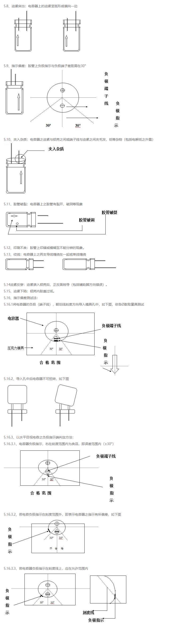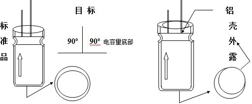 5.7、鋁殼外露:電容器底部(迫緊端)與眼睛垂直時,不可看到鋁殼,電容器頂部與眼睛垂直時,鋁殼外圍必須全部被膠管包住